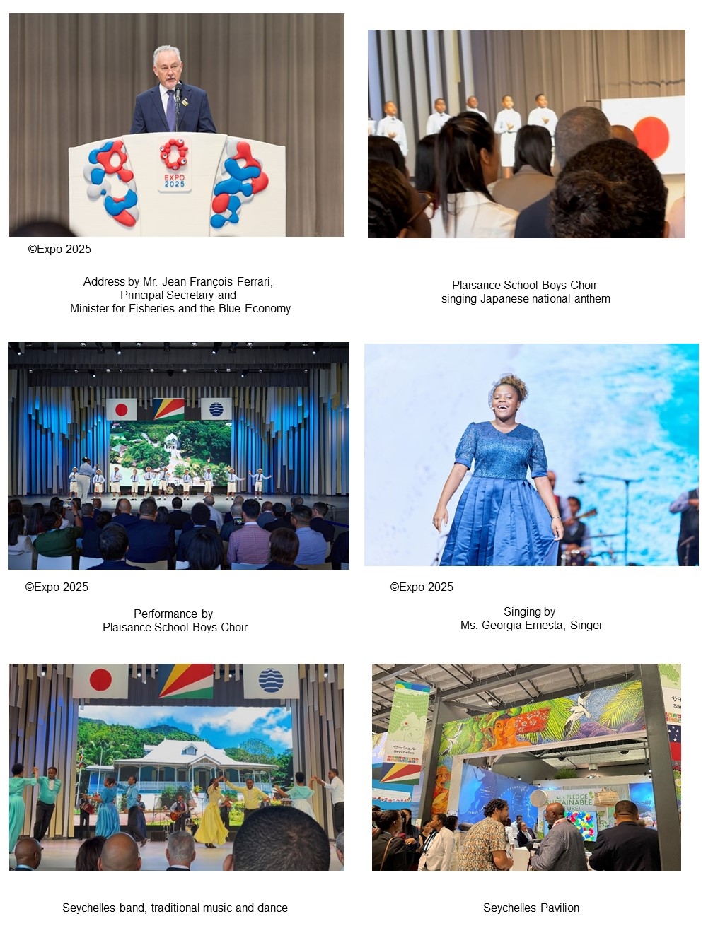 On 7 September 2025, the Seychelles National Day celebration was held at EXPO 2025 Osaka, Kansai, Japan. The Seychelles delegation, led by Mr. Jean-François Ferrari, Principal Minister and Minister for Fisheries and the Blue Economy, visited Japan for the occasion.