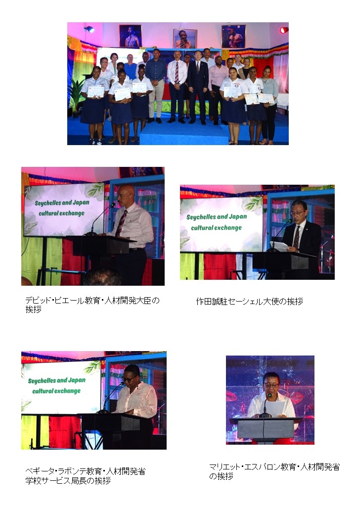 作田大使は挨拶において、参加した学生たちに対し、今回の訪問を礎に日本の大学への留学を検討したり、日本とセーシェルとのつながりをさらに深める方策を見いだしてほしい、そうした取組が両国の絆を一層強固なものにするだろうと述べました。さらに、作田大使は、文化交流を通じ、地域や国の異なる人々が互いの伝統や物の見方、価値観に触れ相互理解を深めることで、誤解や偏見を減らし、平和と協力を促進し、地域的・国際的な課題に共同で取り組むための道を切り拓くことができると述べました。