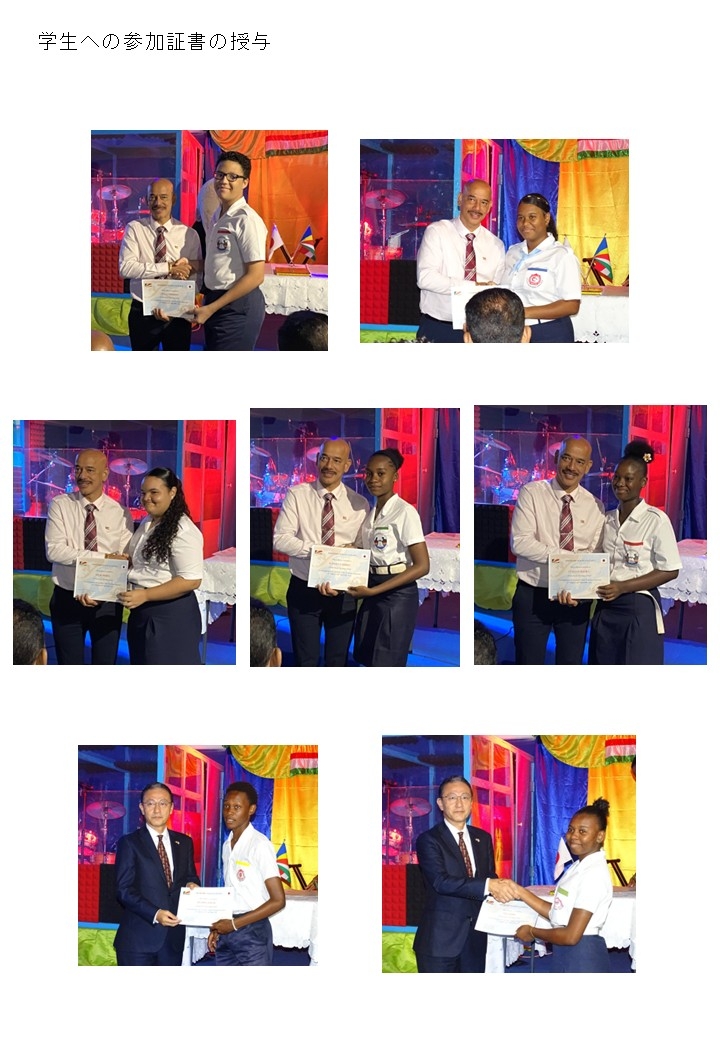 報告会では、学生たちによる訪日体験のプレゼンテーションが行われ、日本の伝統と文化、日本人の尊敬の心や規律を守る姿勢などを学ぶことができたとともに、日本とセーシェルとの友好を深める有意義な機会となった旨語られました。プレゼンテーションの後、ピエール・セーシェル教育大臣および作田大使から、訪日プログラムに参加した各学生に対し、参加証書が授与されました。
