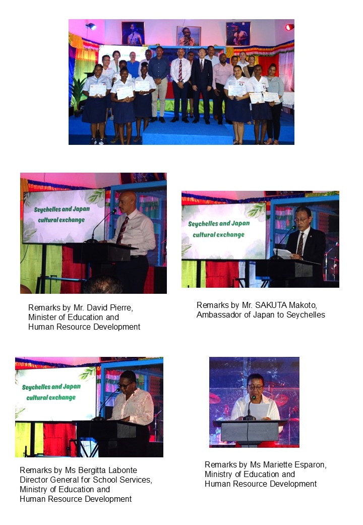At the report session, the students gave presentations on their experiences in Japan, saying they had learned about Japanese traditions and culture, as well as the Japanese spirit of respect and discipline, and that it had been a meaningful opportunity to deepen friendship between Japan and Seychelles. After the presentations, Seychelles Education Minister David Pierre and Ambassador Sakuta presented certificates of participation to each student who took part in the programme.
